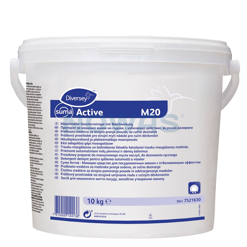 Suma Active M20 er et alkalisk opvaskepulver, velegnet i industri- og husholdningsopvaskemaskiner. Indholdet af alkali sikrer en effektiv fjernelse af fedtstoffer. Formuleringen indeholder ligeledes effektive kalkbindere, som forhindrer kalkudfældning i alle vandforhold, og det aktive klorindhold sikrer effektiv fjernelse af farvede belægninger.
