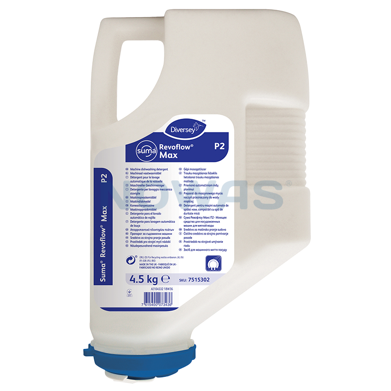 Suma Revoflow Max P2 er et højeffektivt maskinopvaskemiddel i pulverform, specielt formuleret til fjernelse af besmudsning i blødt vand. Suma Revoflow Max P2 er et stærkt alkalisk maskinopvaskemiddel i pulverform. Kan anvendes i alle typer professionelle opvaskemaskiner med automatisk doseringsudstyr. Indholdet af alkali gør produktet effektivt over for fedtstoffer og en blanding af kalkbindere forøger rengøringsevnen og forhindrer kalkopbygning i blødt vand. Suma Revoflow Max P2 styres effektivt via JohnsonDiversey?s RevoFlow doseringsudstyr, som kombinerer fremragende opvaskeresultat, sikkerhed og brugervenlighed.