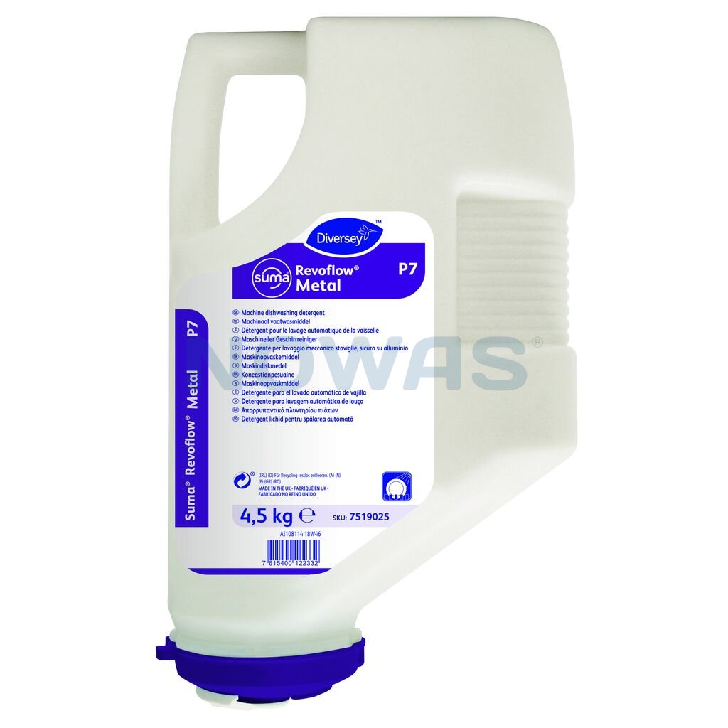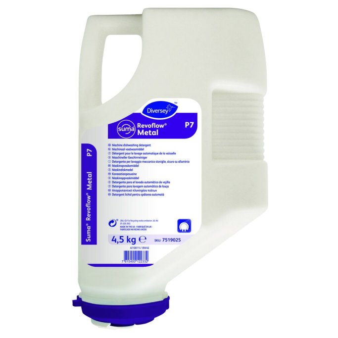 Suma Revoflow Metal P7 er et højeffektivt maskinopvaskemiddel i pulverform, specielt formuleret til fjernelse af besmudsning i blødt vand. Sikkert at anvende på emner af aluminium. Suma Revoflow Metal P7 er et stærkt alkalisk maskinopvaskemiddel i pulverform. Kan anvendes i alle typer professionelle opvaskemaskiner med automatisk doseringsudstyr. Indholdet af alkali gør produktet effektivt over for fedtstoffer og en blanding af kalkbindere forøger rengøringsevnen og forhindrer kalkopbygning i blødt vand. Det aktive indhold af klor medvirker effektivt til fjernelse af farvede belægninger. Desuden indeholder produktet korrosionsbeskytter, så det kan anvendes på emner af aluminium. Suma Revoflow Metal P7 styres effektivt via JohnsonDiverseyís RevoFlow doseringsudstyr, som kombinerer fremragende opvaskeresultat, sikkerhed og brugervenlighed.