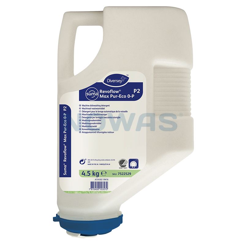 Suma Revoflow Max Pur-Eco 0P P2 er et stærkt alkalisk maskinopvaskemiddel i pulverform som kan anvendes i alle typer professionelle opvaskemaskiner. Indholdet af alkali gør produktet effektivt over for fedtstoffer samt kalkbindere der forøger rengøringsevnen og forhindrer kalkopbygning i blødt vand. Suma Revoflow Max Pur- Eco 0P P2 indeholder ikke fosfat og er svanemærket. Styres effektivt via Diverseys Revoflow doseringsudstyr, som kombinerer fremragende opvaskeresultat, sikkerhed og brugervenlighed.