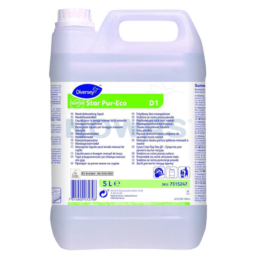 Suma Star Pur-Eco er et koncentreret flydende håndopvaskemiddel til rengøring af potter, pander, porcelæn, glas og andre vaskbare emner. Formuleringen giver fremragende brugsøkonomi. Fjerner fedt og fastsiddende madrester og nem efterskylning sikrer stribefrit og flot resultat. Det stabile skum bevirker længere og mere effektiv anvendelse af brugsopløsningen.