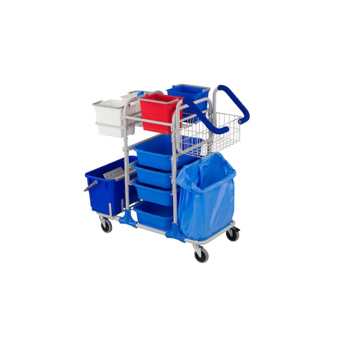 Her er den ideelle rengøringsvogn til dig som har brug for meget plads til opbevaring. Rengøringsvognen fra DIT kommer nemlig med 4 bakker, 4 x 6 ltr spande og en stor trådkurv. Der er sækkeholder til affaldssækken, og plads til sæben øverst ved 2 af spandene.