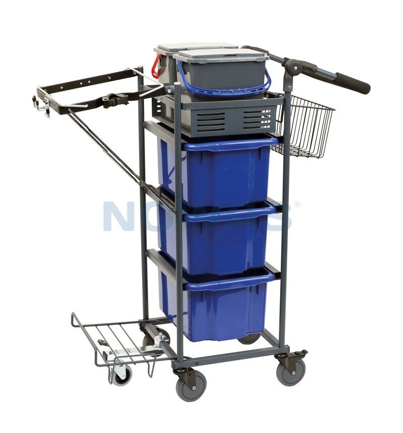 Slimline trolley der har mange unikke funktioner. Kørehåndtaget er justerbart i højden og er udstyret med et blødt greb. Sækkeholderen og sækkehylden foldes hurtigt og nemt sammen uden værktøj. Skråningerne kan monteres med tætsiddende snaphætter for at bevare præimprægnerede mopper og klude. Rengøringsvognen har plads til to skafter.