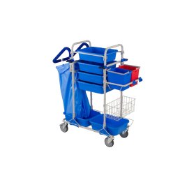 Super fin rengøringsvogn fra DIT der er en smule smallere end mange andre rengøringsvogne, hvorfor den er velgegnet til at have med rundt på smalle områder. Med denne regøringsvogn fra DIT medfølger 2 x 6 ltr spande, en sækkeholder, en trådkurv, 4 skuffer og 2 bakker.