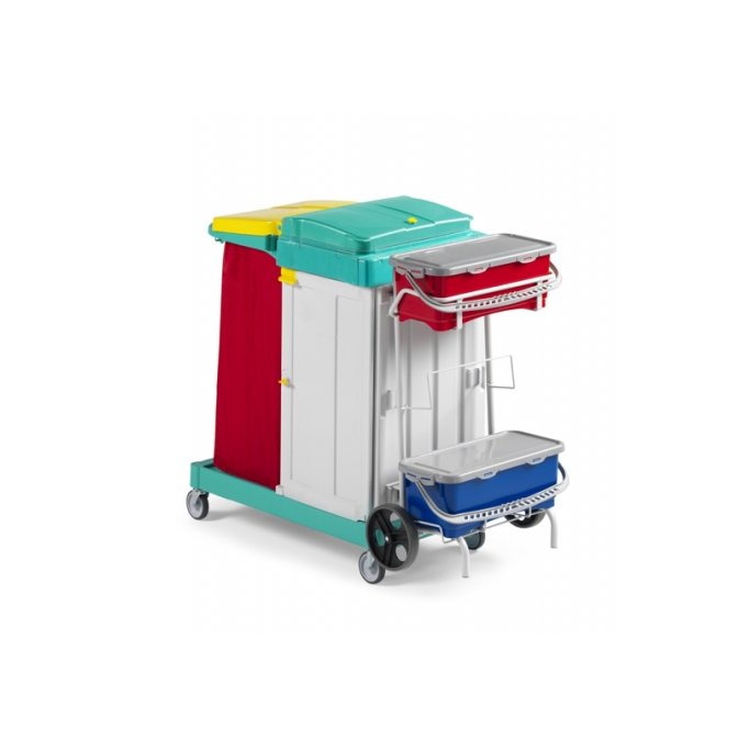 Flere spande med tætsluttende låg, si, gitre, skuffer, sækkeholdere i de forskellige kombinationer tillader at bruge vognen i forskellige systemer for overfladerengøring.