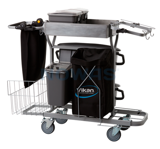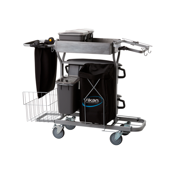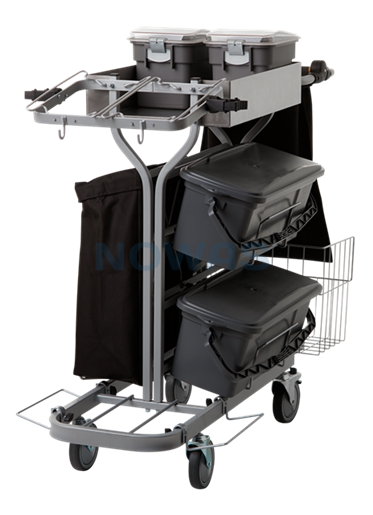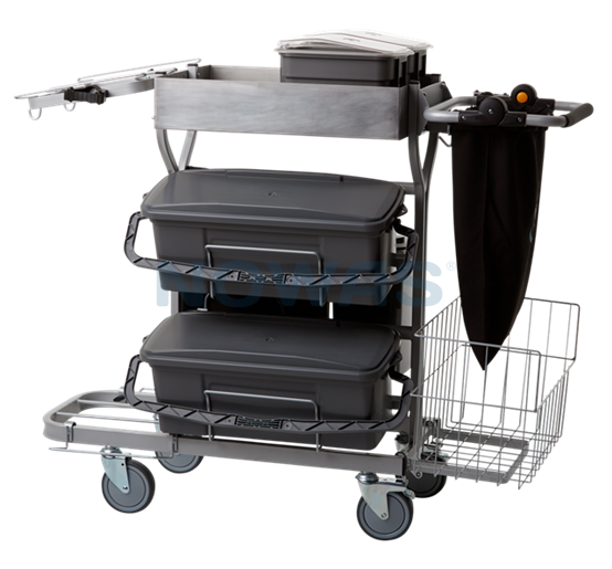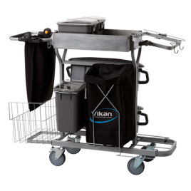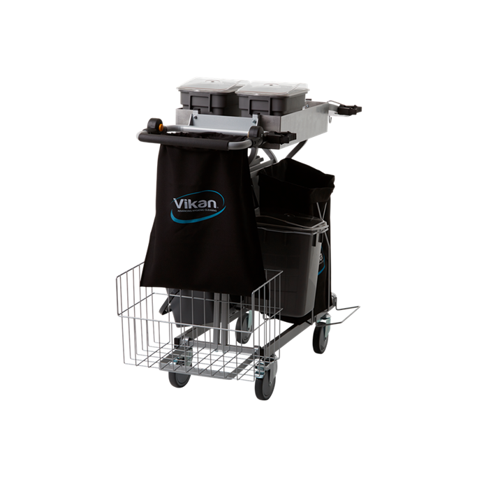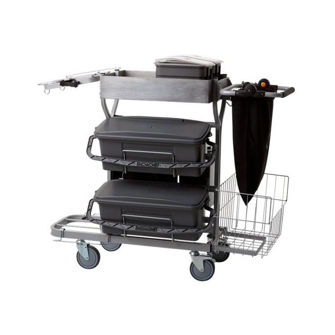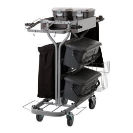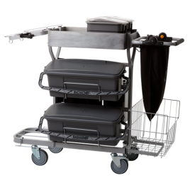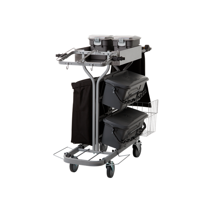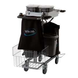 Kompakt Plus 40 rengøringsvogn har plads til præparerede mopper, papirvarer og sæbeopbevaring. Den kompakte størrelse gør den ideel til travle områder og nem opbevaring på steder med begrænset plads. Vognen kan tilpasses med yderligere tilbehør til det specifikke anvendelsesområde.