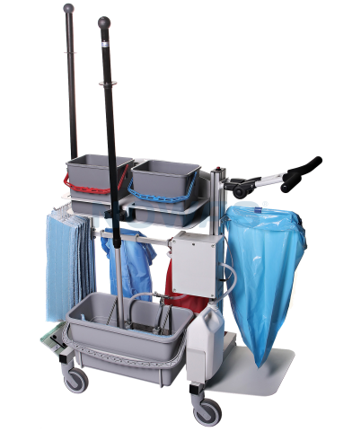Multijusterbar og ergonomisk vogn med sprøjtefunktion der kan give mopperne den bedst mulige dosering. Dette reducerer vandforbrug og brug af rengøringsmiddel.
