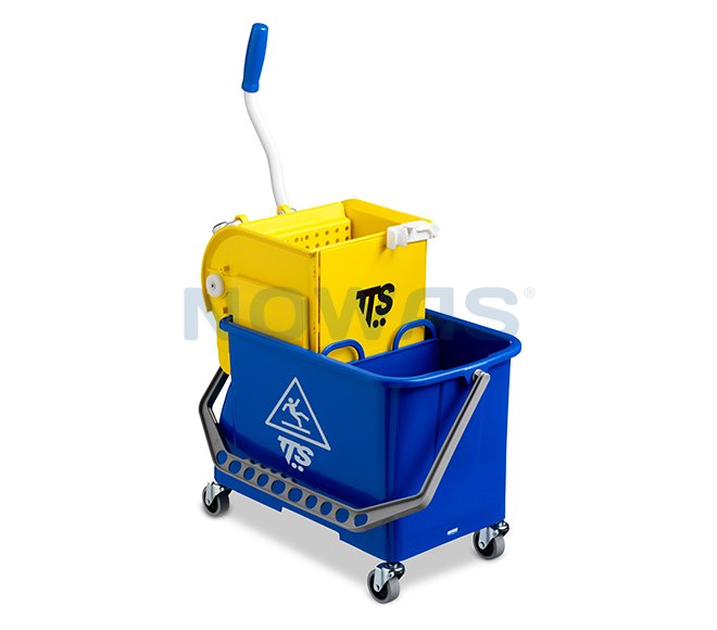 En praktisk lille vaskevogn med presse, som anvendes til fladmopper.