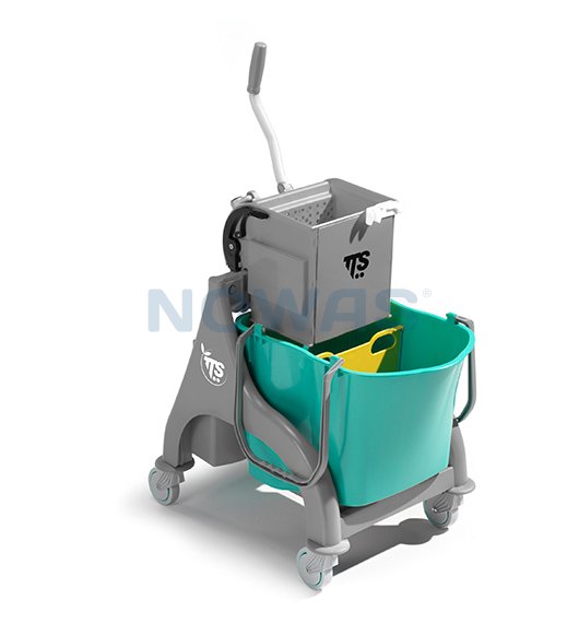 Rengøringsvognen er med monteret moppe-vrider, 80mm. hjul, store rengøringsspande samt opbevaringsplas til rengøringsmidler.