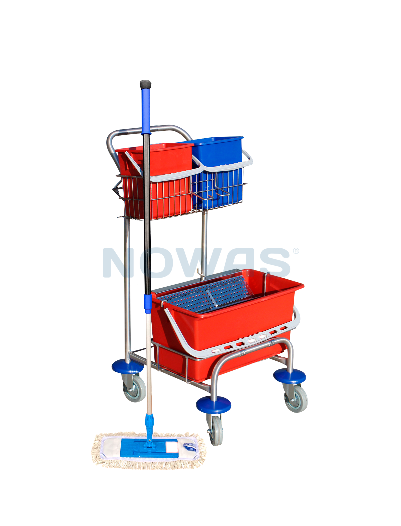 Komplet rengøringvogn med 2x6 ltr. farvekodet spande + 1x25 ltr. spand med drypsystemsrist. Rengøringsvognen er monteret med 100 mm. gummi hjul med indvendige kuglelejer. Rengøringsvognen bliver leveret med skaft, fremfører og en rengøringsmoppe. Vognstellet er lavet i rustfri stål og er perfekt til steder hvor der er behov for en lille let rengøringsvogn. Vognen er let og lille, hvilket gør at den er nem at håndtere og transportere frem og tilbage, selv over dørtrin og lign. forhindringer. Mål: H 103 cm. x L 66 cm. x B 49 cm. - vægt 12 kg.