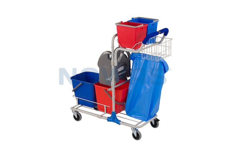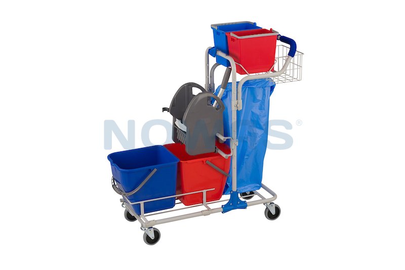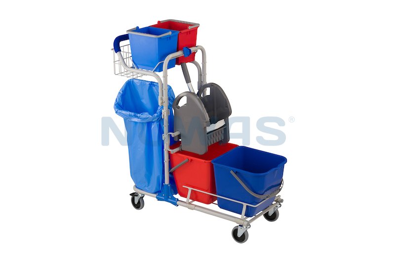 Denne DIT rengøringsvogn er smallere end de fleste rengøringsvogne, hvilket gør den velegnet til at have med rundt på smalle områder. Der medfølger 2 x 18 ltr spande, og der er plads til at montere en presse over disse. Derudover får man 2 x 6 ltr spande, en trådkurv og en sækkeholder.