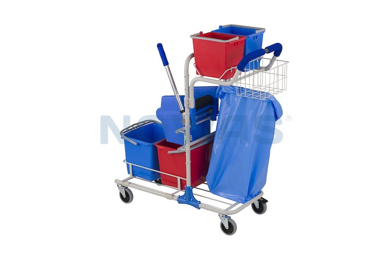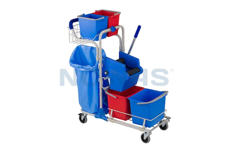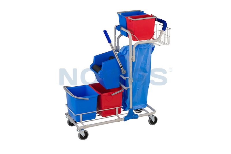 Denne DIT rengøringsvogn er smallere end de fleste rengøringsvogne, hvilket gør den velegnet til at have med rundt på smalle områder. Der medfølger 2 x 13 ltr spande, og der er plads til at montere en presse over disse. Derudover får man 2 x 6 ltr spande, en trådkurv og en sækkeholder.