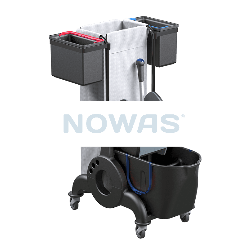 - Stabil og robust vogn med gulvvaskespand og inventarspande, vertikalpresse og sækkeholder