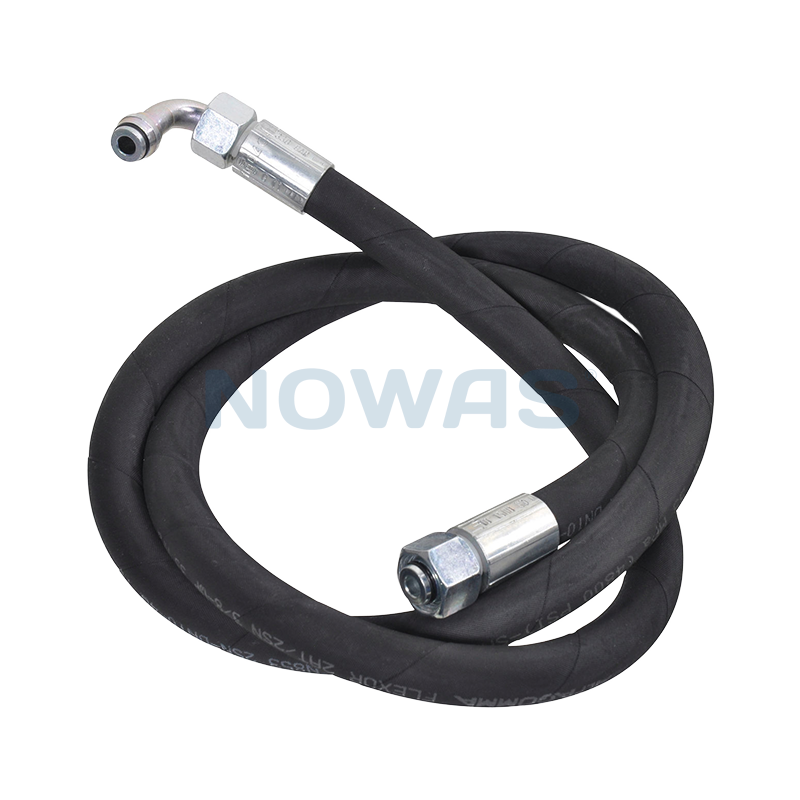 Højtrykslangen bliver leveret med en 90° vinklet pres-fitting i den ene ende og en lige pres-fitting i den anden ende.