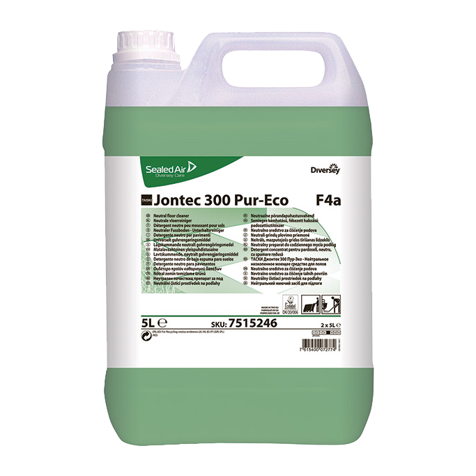 TASKI Jontec 300 Pur-Eco er et lavtskummende gulvrengøringsmiddel med parfume til alle hårde gulve, der tåler vand. Kan anvendes med alle rengøringsmetoder, inklusive gulvvaskemaskiner, skuremaskiner og manuel gulvvask.