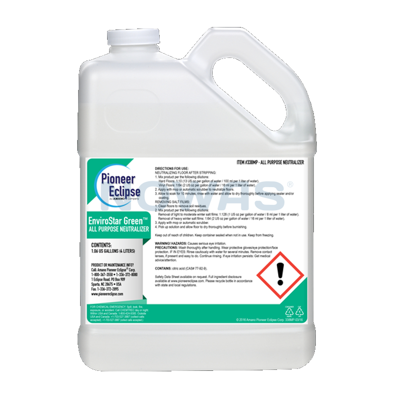Envirostar Green All Purpose Neutralizer er en koncentreret "grøn" neutraliserende løsning, der er effektiv på keramiske fliser og alle typer af stengulv. Neutralizer nedbringer ph-værdien og øger vedhæftning af polish til gulve, hvor alkalinitet er et problem. Anvendes efter opskuring.