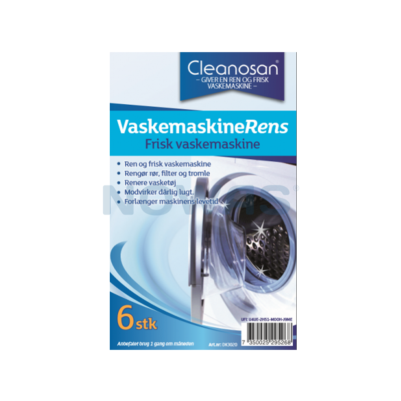 Disse nye Cleanosan vaskamaskine tabs sikrer korrekt dosering, sparer tid og forlænger levetiden på vaskemaskinen. Den smarte tabs rengører både tromlen, rørene, filtrene og fjerner eventuel dårlig lugt. 1 pakke indeholder 6 tabs og renser hele vaskemaskinen. Cleanosan giver en ren og velduftende vaskemaskine, hvilket også giver rent og velduftende vasketøj.