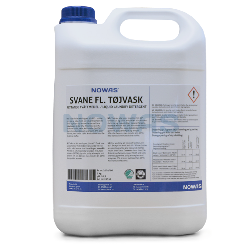 Svanemærket flydende tøjvaskemiddel. Kraftigt virkende alkalisk tøj vaskemiddel, til vask af alle tekstiltyper, og velegnet ved alle temperaturer 30-95 gr.