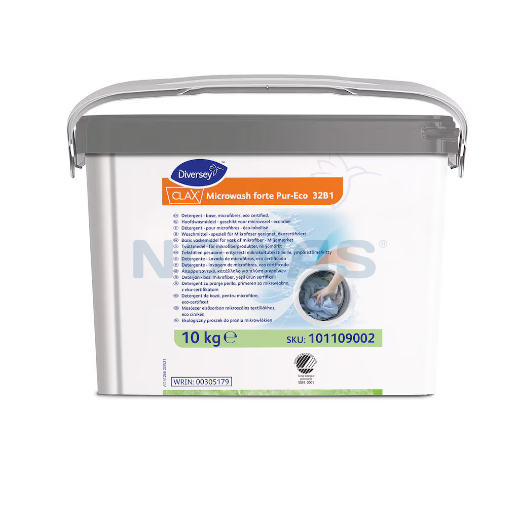 Clax Microwash forte Pur-Eco vasker effektivt tekstilemner, fremstillet af mikrofibre, som rengøringsklude og -mopper. Produktet medvirker effektivt til at bevare strukturen i mikrofibrene og sikrer, at mikrofiberklud/moppe bevarer den høje rengøringseffekt. Formuleringen i Clax Microwash forte Pur-Eco opfylder kravene fra producenter af mikrofibermaterialer. Kan også anvendes på farvede tekstiler, da det ikke indeholder blegemidler. Clax Microwash forte Pur-Eco er et enzymatisk tøjvaskemiddel i pulverform, baseret på effektive overfladeaktive komponenter, kalkbindere, forhindring af gråning og metalbeskyttere. Netop den kemiske sammensætning resulterer i fremragende egenskaber i forbindelse med fjernelse af fedt/olie og andre smudsarter og medvirker til opløsning af besmudsningstyperne. Fosfaterne i produktet sikrer nedbrydning af forekommende kalk i vandet og forhindrer udfældning af de øvrige kemiske råvarekomponenter. Fosfaterne forhindrer også gråning af tekstilerne ved at holde besmudsningerne svævende i vaskevandet (forhindrer genudfældning på tekstilerne). Derudover modvirker de andre råvarekomponenter genudfældning af smuds.