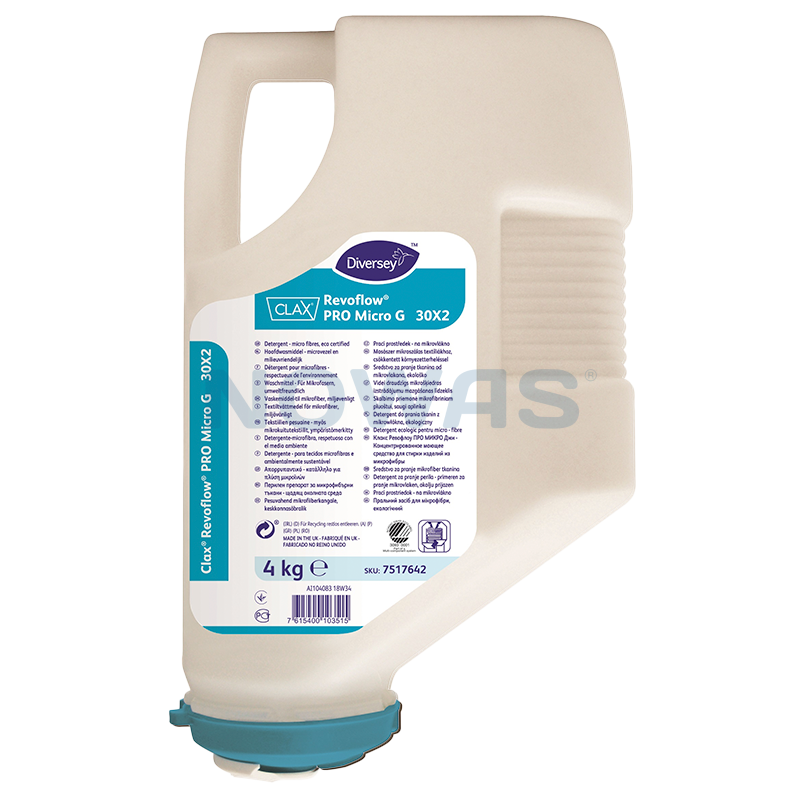 Clax Revoflow PRO MICRO G er et koncentreret vaskepulver til klarvask beregnet til brug i Revoflow-systemet. Clax Revoflow PRO Micro G er et højkoncentreret pulver, som er blevet udviklet til brug i professionelle vaskerier og kan anvendes i alle vandhårdheder. Clax Revoflow PRO MICRO G er også specielt formuleret til vask af microfiber og sarte farvede tekstiler. Clax Revoflow PRO MICRO G er et svanemærket produkt.