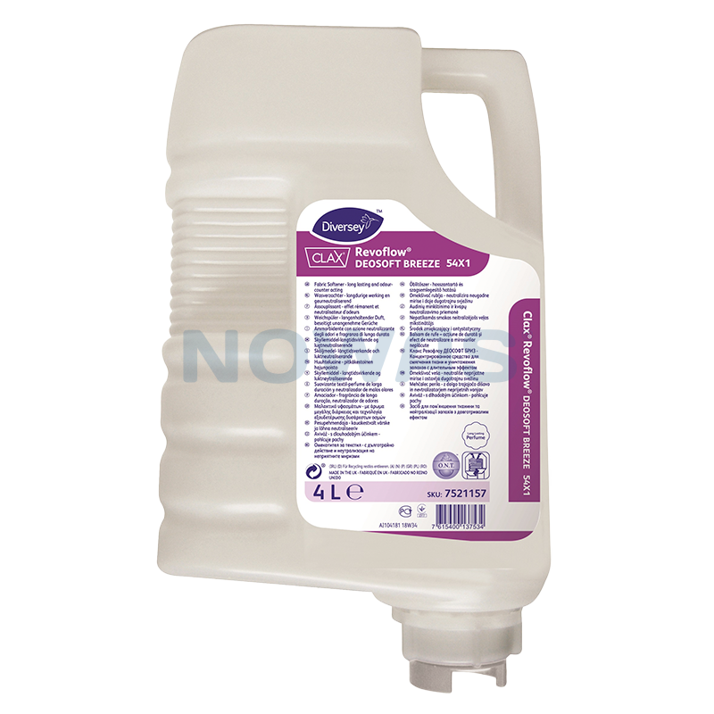 Clax Revoflow DEOSOFT BREEZE er et højkoncentreret skyllemiddel baseret på biologisk nedbrydelige kationer. I vaskeopløsningen adsorberer disse positivt ladede kationer, til stoffets negativt ladede overflade, hvilket har en effekt der mindsker tekstilernes evne til at krølle. Under tørreprocessen modvirker dette tilstopning og opbygning af statisk elektricitet. Clax Revoflow DEOSOFT BREEZE indeholder en moderne langtidsvirkende perfume som giver ekstra friskhed til tekstilerne. Skyllemiddlet indeholder også lugtneutraliserende teknologi. Denne teknologi reagerer mod lugten af urin som kan sidde fast i materialet, selv efter vaskeprocessen. Den maskerer ikke den dårlige lugt, men eliminerer permanent de molekyler som afgiver den dårlige lugt. Clax Revoflow DEOSOFT BREEZE kan anvendes med de fleste tekstiler, men er særdeles effektivt med voluminøs eller teksturerede materialer som håndklæder. Det giver også en blød, silkeagtig fornemmelse på vævet eller fladt strikkede tekstiler.