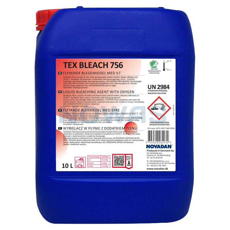 Dette blegemiddel er fri for klor, parfume og farvestoffer, og er derfor velegnet til brug i miljøer med høje hygiejnekrav. Det anvendes sammen med et basisvaskemiddel og opnår optimal blegeeffekt ved temperaturer mellem 60-90C. Tex Bleach 756 er desuden skånsomt mod almindelige metallegeringer og plastmaterialer.