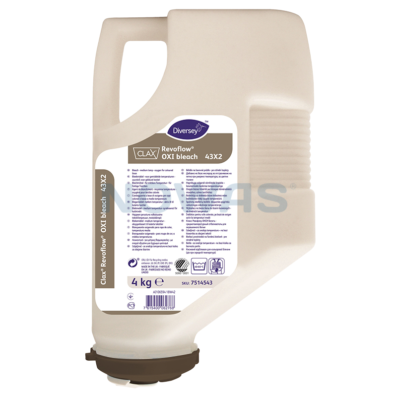 - Med en passende dosering kan Clax Revoflow OXI anvendes til termiskkemisk desinfektion ved 40 °C